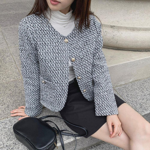 옷자락 / 여자 오피스룩 금장단추 노카라 트위드 긴팔 자켓