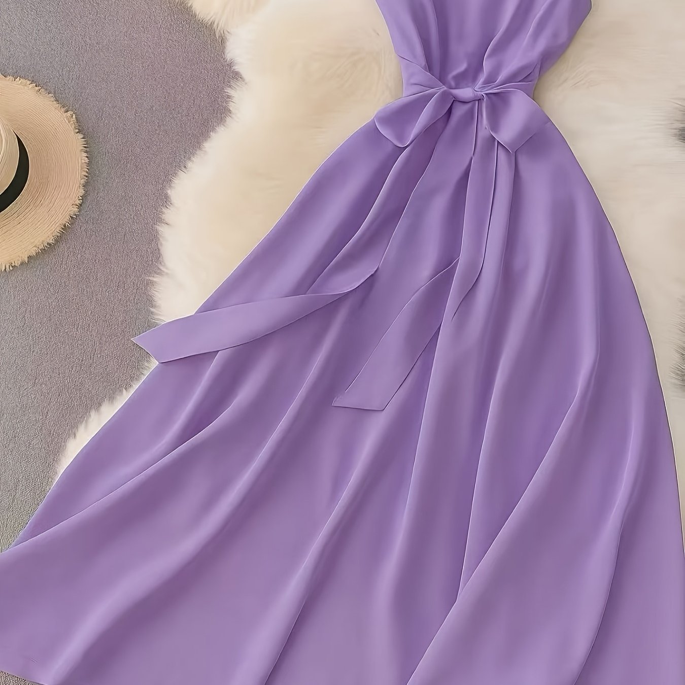 TEMU 2025 봄/여름 신상 스타일 V넥 우아한 허리 묶는 보라색 단색 여성 드레스