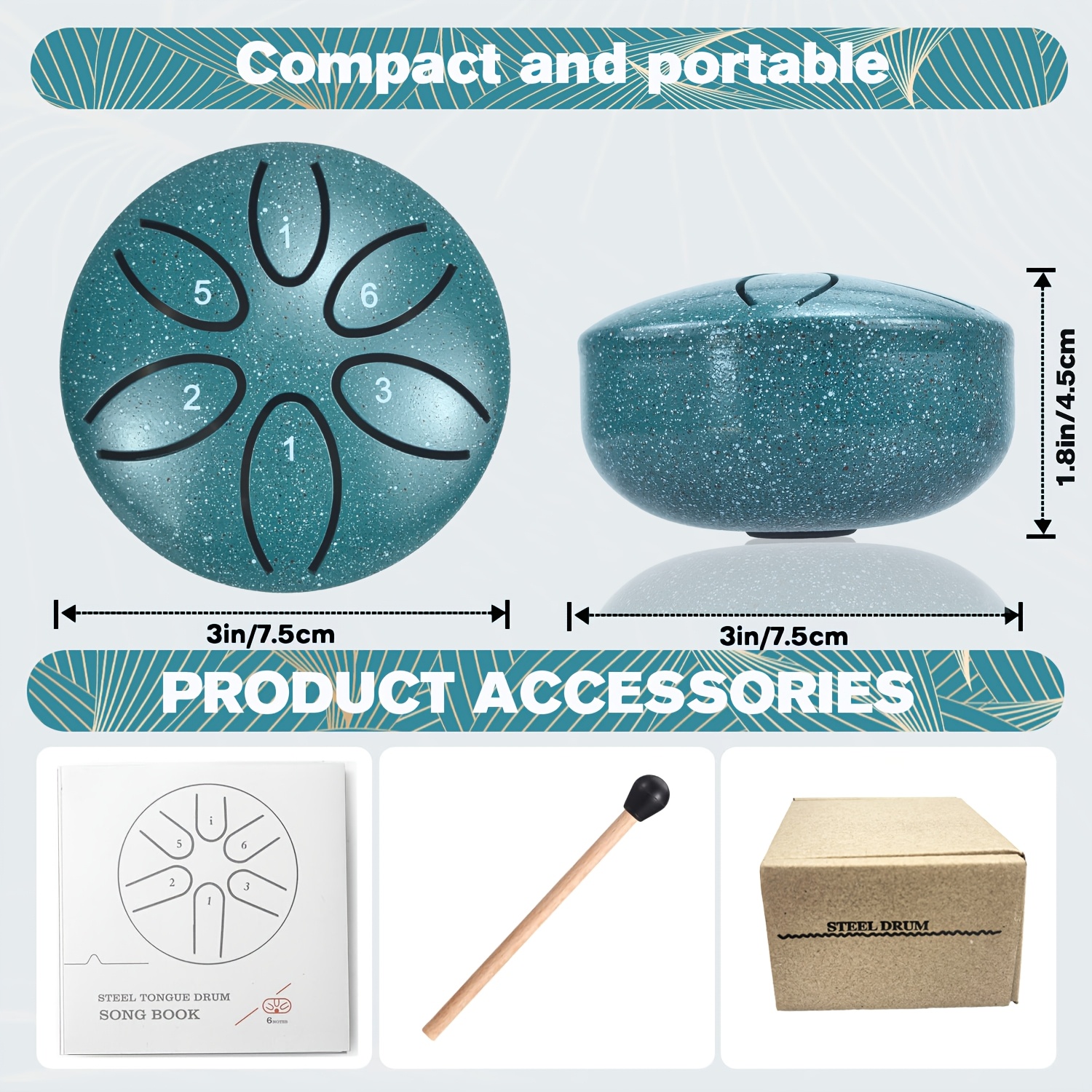 TEMU 휴대용 컴팩트 3인치 6음 레인 드럼/스틸 텅 드럼, 타이코/에테리얼 드럼 — 드럼스틱 + 음악 매뉴얼 포함 미니 휴대용 핸드 드럼 악기, 진정 명상용 레인 사운드 드럼, 초보자 및 야외 비 오는 날, 캠핑, 요가, 명상, 야외 활동에 적합, 크리스마스, 할로윈 음악 선물로 완벽한 친구, 가족, 동료, 음악 초보자를 위한 선물