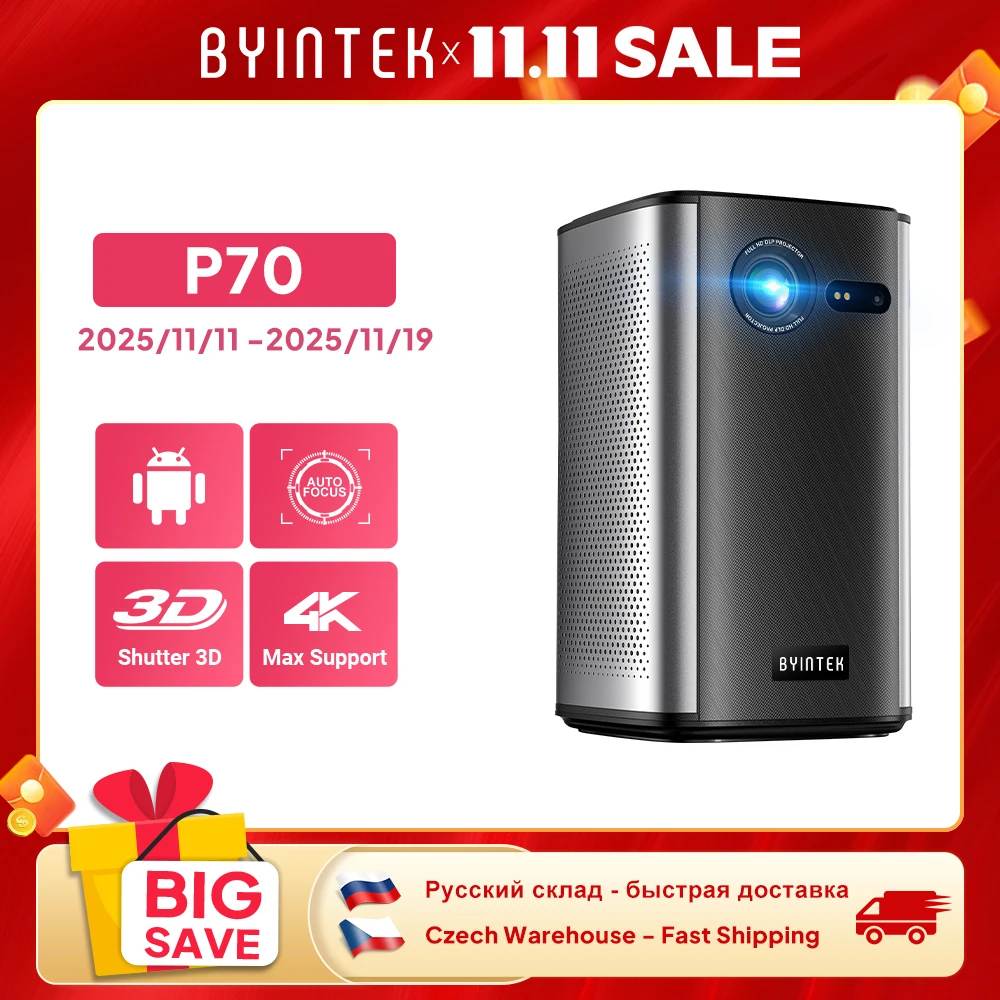 BYINTEK 미니 휴대용 프로젝터 DLP 자동 초점 스마트 안드로이드 와이파이 LED 1080P 홈 시어터 비디오 프로젝터, 배터 포함, P70 3D 4K