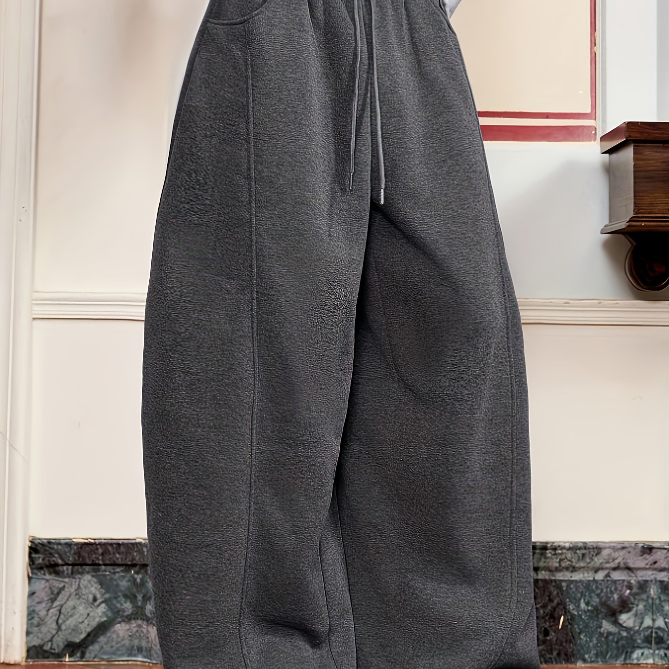 TEMU 남성용 다크 그레이 트렌디 베이직 다용도 심플 루즈 와이드 레그 캐주얼 스포츠 팬츠, 가을/겨울용 드로스트링 포켓 디자인