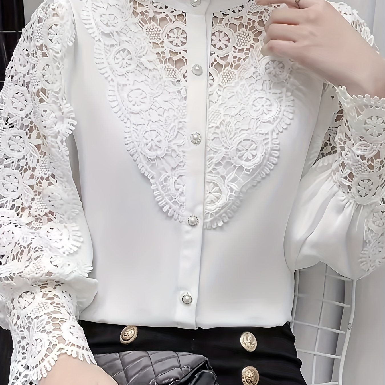 TEMU 2024년 신상 여성용 스탠드 칼라 셔츠, 할로우 아웃 스플라이싱, 우아한 긴팔 탑