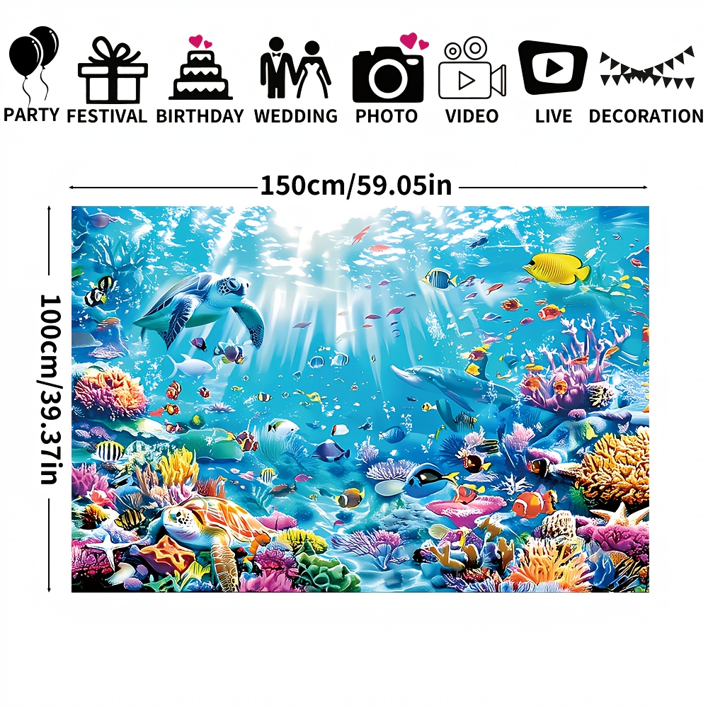 TEMU 1개, 해양 생물 사진 배경, 150*100cm 폴리에스터 섬유 바다 바닥 장식 배너, 바다거북과 물고기와 산호 포함, 파티 및 여름 활동용 범용 축제 장식, 전기가 필요 없음