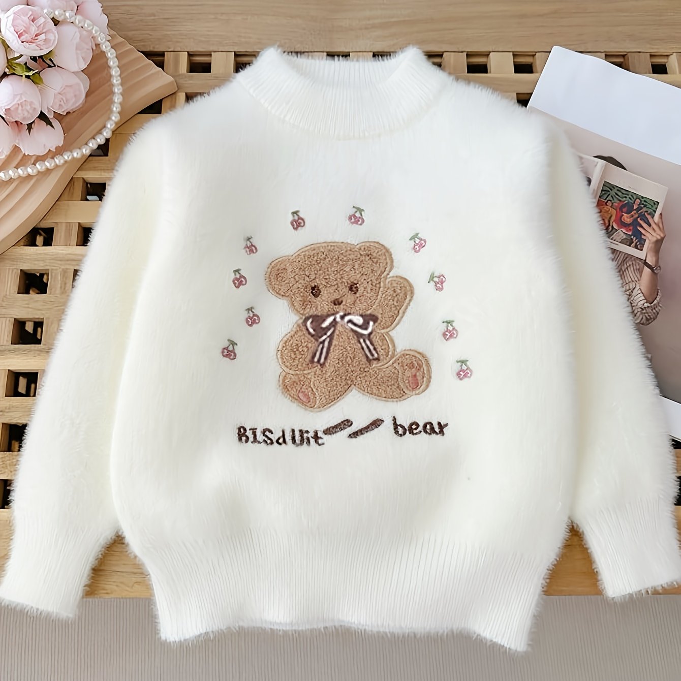 TEMU 새로운 가을-겨울 여아용 안감 포근한 니트 풀오버, 귀여운 체리 베어 자수, 외출용
