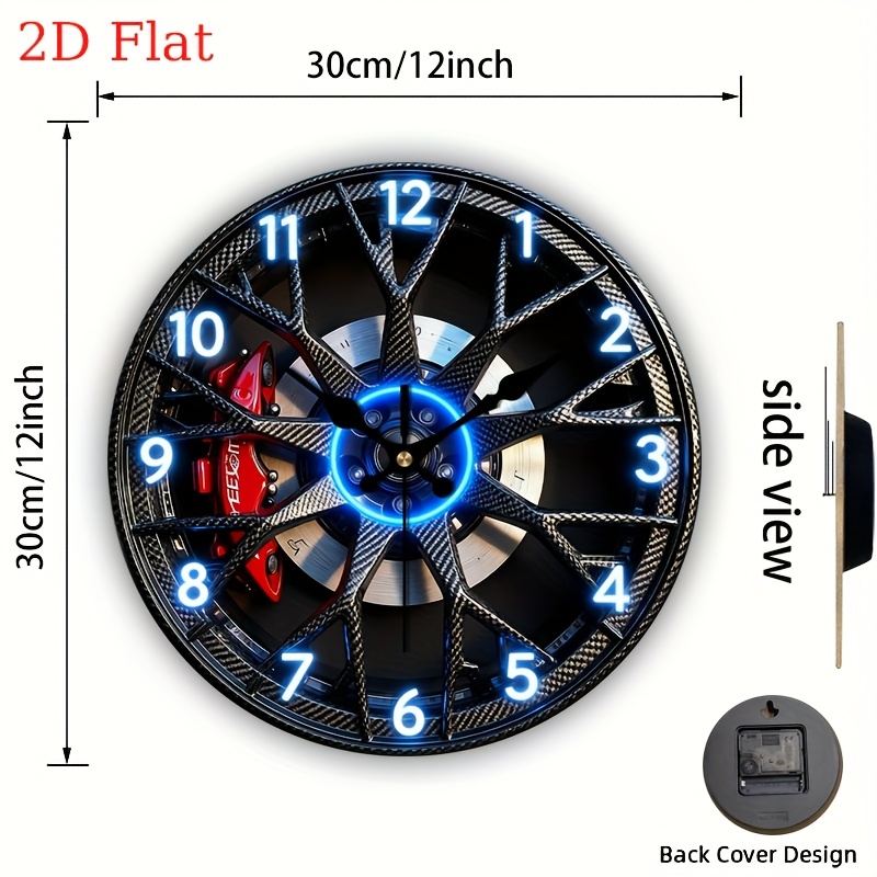 TEMU 2D 평면. 1개. 자동차 휠캡 루미너스 테크 스타일 벽시계 - 무소음 라운드 벽시계 - 침실, 거실, 사무실, 주방, 욕실에 완벽한 장식 - 12/14인치 (AA 배터리 미포함) 할로윈 크리스마스 장식, 2D 평면