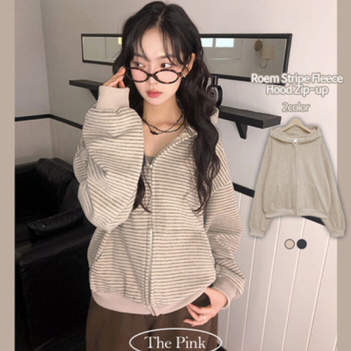 더핑크 / 로엠 오버핏 스트라이프 후리스 후드 집업