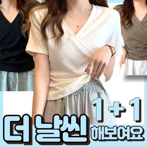 [에이치플러스몰]더 날씬한 여름 셔링 브이넥 여성티 반팔 티셔츠 탑 옆 면티 시스루티 해외여행 셔링 브..