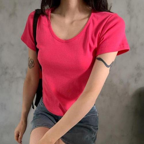 [다잇템]여성 원컬러 U넥 둥근밑단 반소매 티셔츠