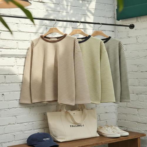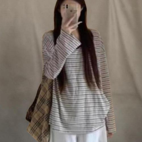 [미라클세븐]여성용 스트라이프 U넥 오버사이즈 긴팔 티셔츠
