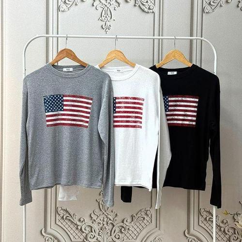 [다잇템_패션]여성 보온 롱슬리브 편한 U넥 성조기 티셔츠