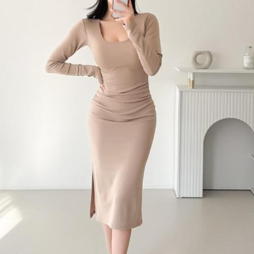 여자 셔링 슬림핏 U넥 사이드 트임 미디 원피스