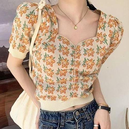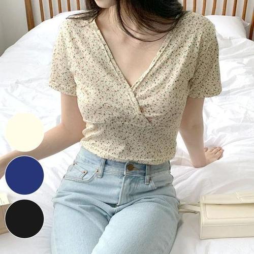 [셀러허브_여성트랜드패션]여자 꽃무늬 티셔츠 스판 반팔티 여름 V넥 크롭 슬림
