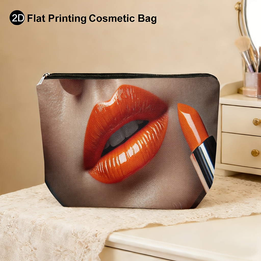 TEMU 1개 밝은 오렌지 립스틱 패턴 휴대용 리넨 메이크업 파우치, 재사용 가능, 여성용 화장품 가방, 지퍼 포함 야외 필수 수납 가방, 여성 생일, 크리스마스, 새해 선물