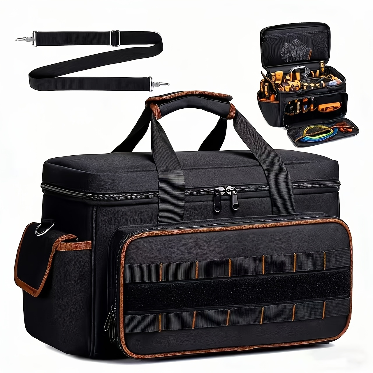 TEMU 대형 헤비듀티 공구 가방, 초내구성 소재로 제작된 탁월한 하중 지지력. 다중 수납공간과 개방형 디자인, 조절 가능한 어깨끈. 전문 정리사를 위한 설계, 목수, 정비공, 홈 오거나이저에게 필수 아이템