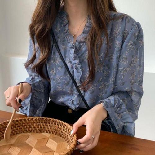 [에이치플러스몰]봄 여름 프릴 긴팔 블라우스 여성 쉬폰 브이넥 셔츠