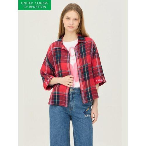 [베네통]자수 커프스 린넨 체크 블라우스_BABLA2631