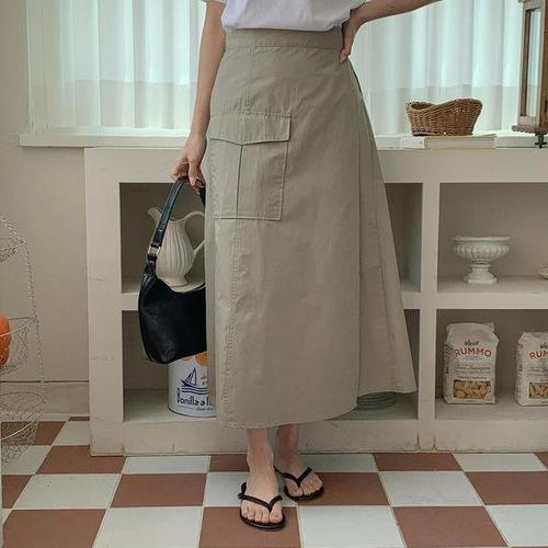 스트릿 스타일 뒷트임 롱스커트 카고 포켓 여름 플 여름 치마 롱 샤 스커트 여성 플레어