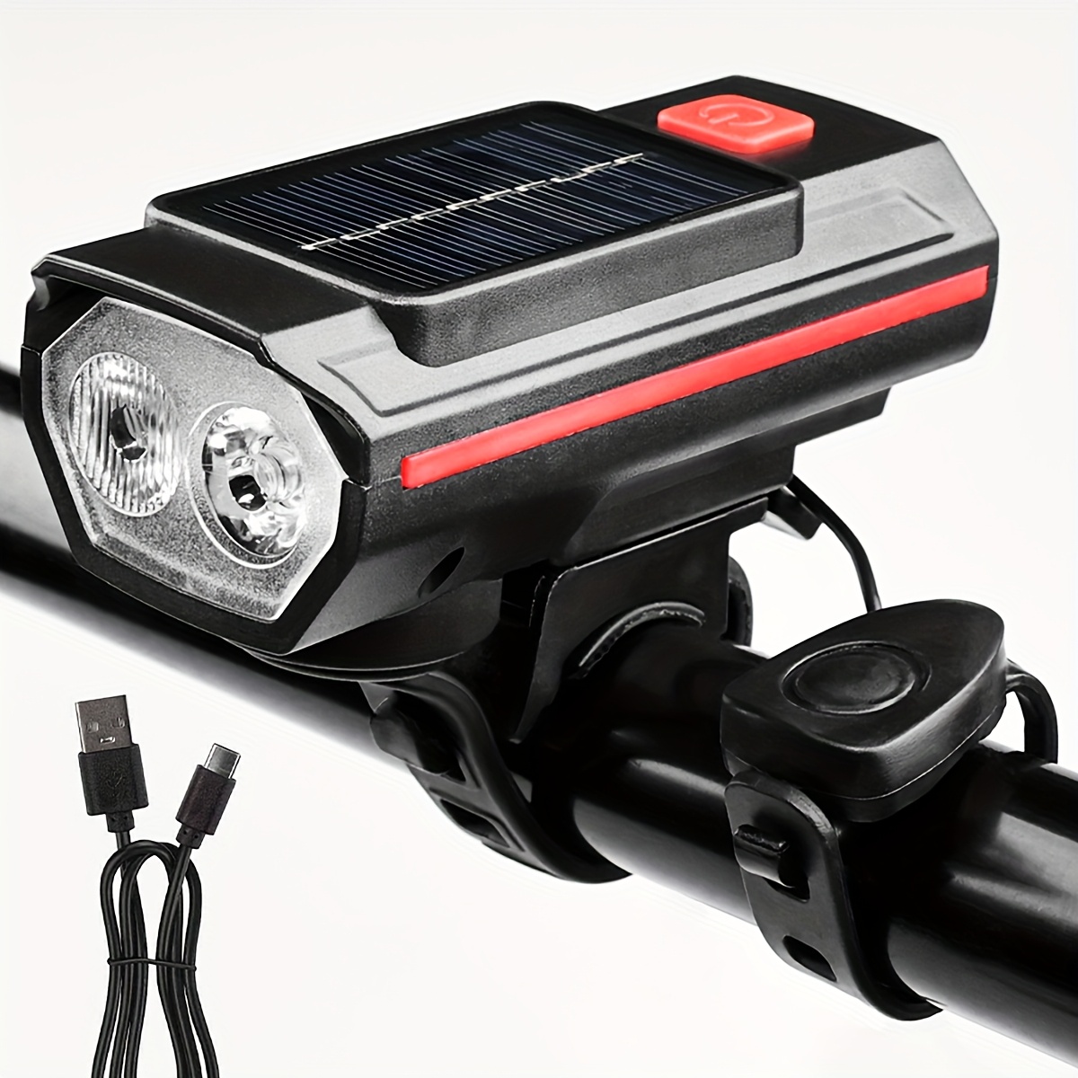 TEMU 자전거 전조등, 방수 태양광 헤드라이트, 듀얼 충전 모드, 고음량 경적, USB 휴대용 충전