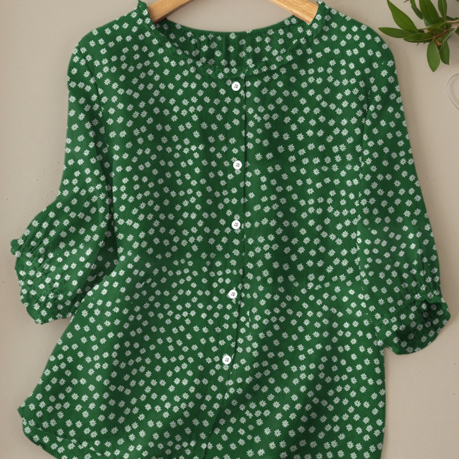 TEMU 여성용 우아한 빈티지 플로럴 셔츠, 7부 소매, 레이스 라운드넥, 싱글 버튼 장식, 젊고 청순한 디자인