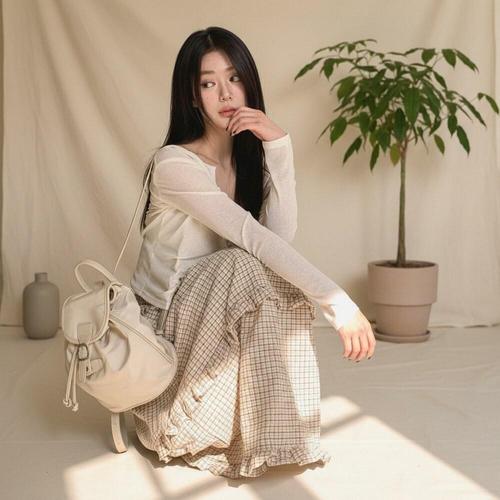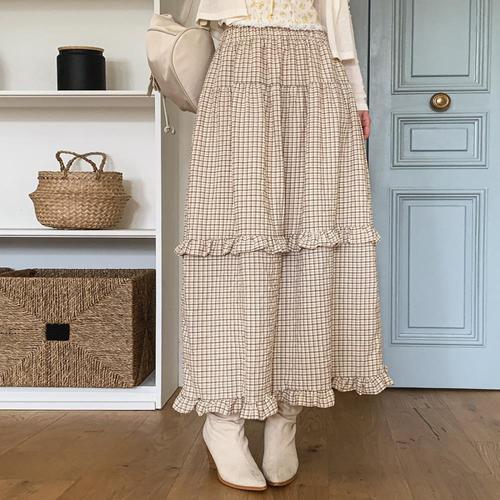 [옷자락]여성 봄가을 일상 체크 밴딩 프릴 롱스커트
