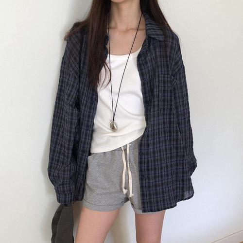 빈티지 플래드 셔츠 여성 가을 긴팔 오버사이즈 버튼업 셔츠 한국 패션 캐주얼 가을 아우터 탑 블라우스