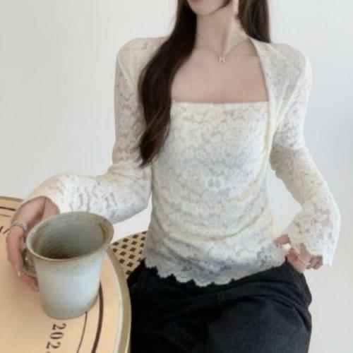 [신상오픈런]여성용 겨울 가을 기모 레이스 긴팔 크롭 티셔츠