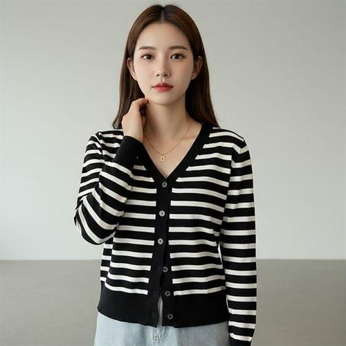 [골피아]여성 스트라이프 가디건 심플 베이직 가을 슬림 아우터 V넥 슬림핏 긴팔 간절기 아우터
