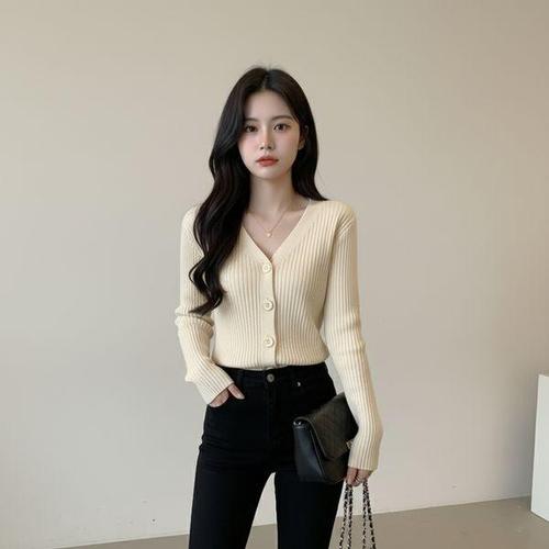 [골피아]여성 골지 슬림핏 가디건 긴팔 브이넥 왕단추 봄 가을 간절기 니트 무지 오피스룩 아우터