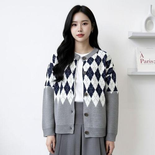 [골피아]여성 가디건 긴팔 아가일 패턴 봄 가을 기본 베이직 간절기 캐주얼 라운드넥 아우터