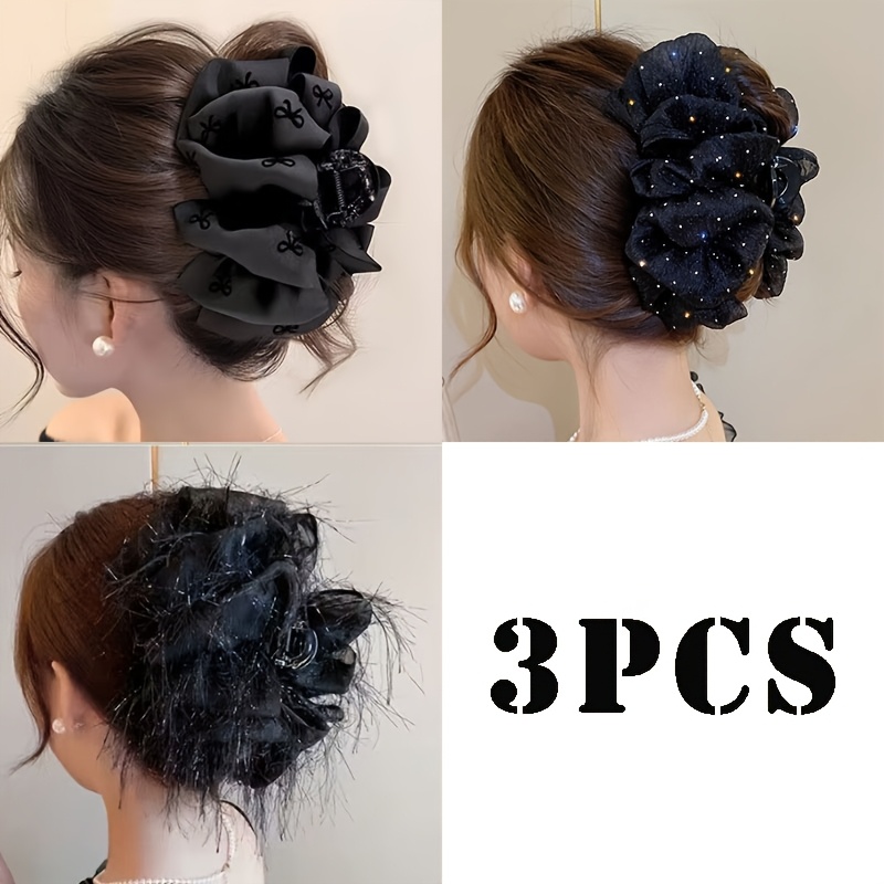 TEMU 3개 세트 우아한 블랙 구름 버블 클로 클립 세트 여성 헤어 스타일링 대형 상어 클립 별이 빛나는 하늘 블랙 리본 블랙 태슬 블랙 3피스 헤어 클립