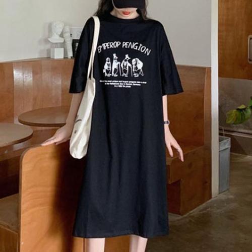[다잇템]여성 검정 캐쥬얼 롱슬리브 필기체 슬릿 원피스