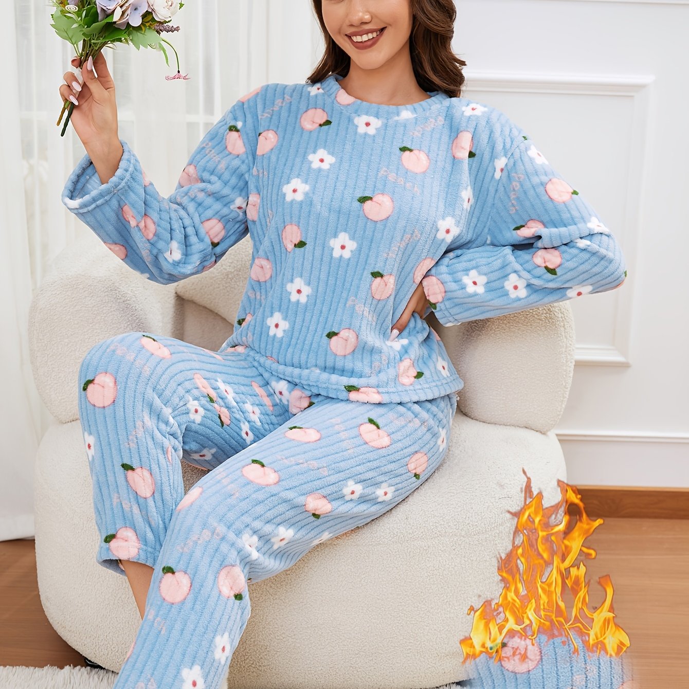 TEMU 플러시 안감 도톰한 파자마 세트 2개, 심플하고 스타일리시한 과일 패턴 긴팔 긴바지 라운지웨어, 여성용 겨울 야외 활동복 세트