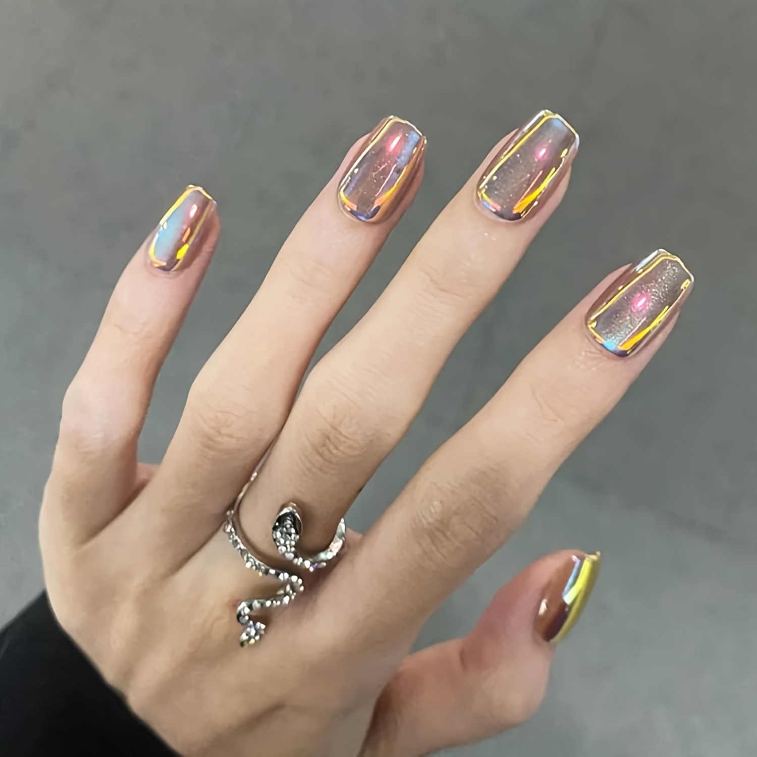 TEMU 스퀘어 프레스온 네일 숏 골든 크롬 인조네일 반짝이는 미러 아크릴 네일 오로라 네일 광택 인조네일 스틱 여성용 네일 32pcs