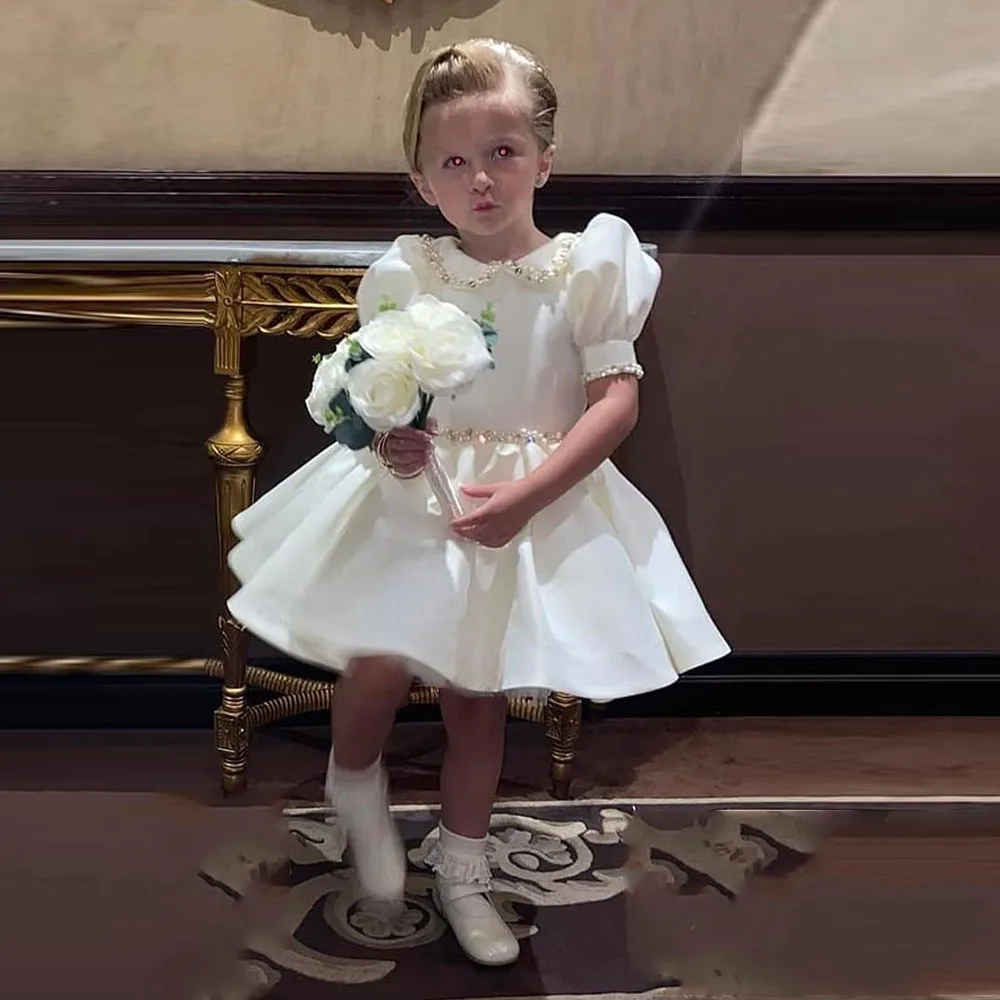 미니 짧은 꽃무늬 소녀 드레스 O넥 A라인 짧은 소매 무릎 길이 비딩 아동 드레스 웨딩용