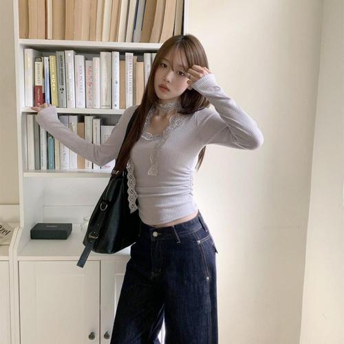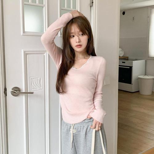 [옷자락]여성 레이스 단추 브이넥 골지 슬림 긴팔 티셔츠