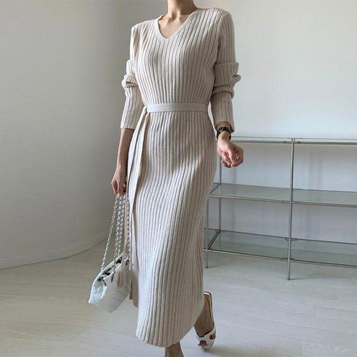 뜨개진 여성용 쫀쫀 뒷트임 브이 골지 쉐일리 롱 원피스