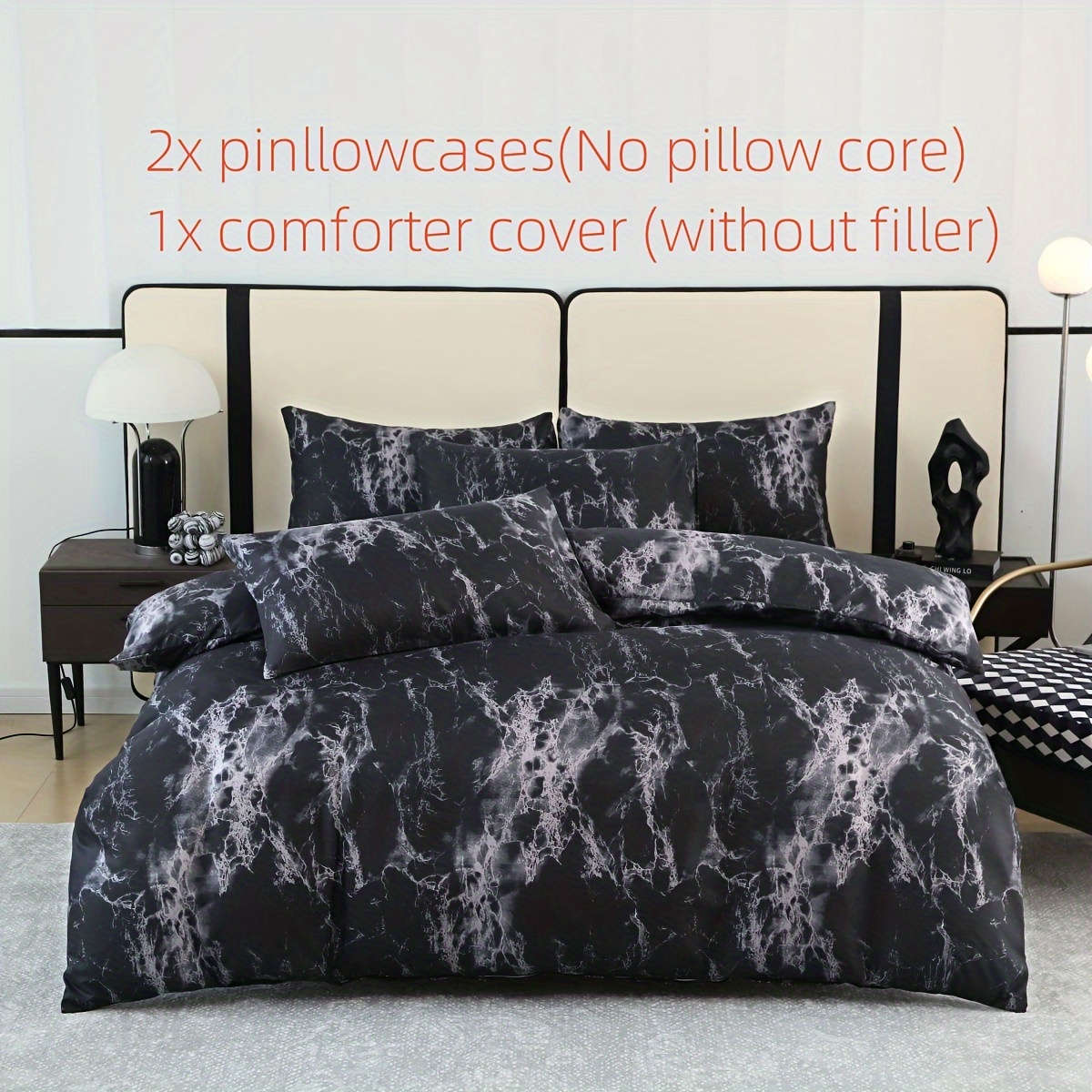 TEMU 3피스 브러시드 마블 패턴 이불커버 세트, 이불커버 1개 + 베개커버 2개, 블랙 마블, 부드러운 침구, 충전재 없음