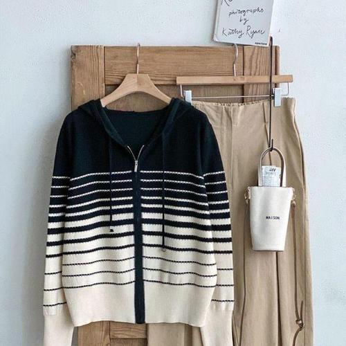 [옷자락]여성 그라데이션 투톤 스트라이프 집업 후드 니트 가디건