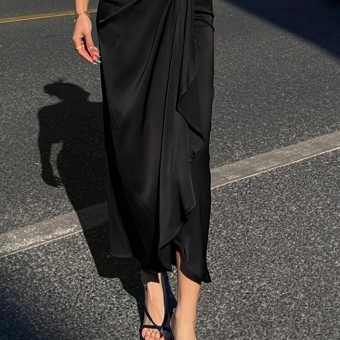 TEMU 여성용 스타일리시 비대칭 러플 헴 맥시 스커트 - 블랙, 버튼 디테일, 하이웨이스트, 플로우 디자인, 여름에 완벽, 캐주얼부터 포멀웨어까지, 캐주얼 여름 착용 | 비대칭 헴 스커트 | 버튼 디테일 스커트