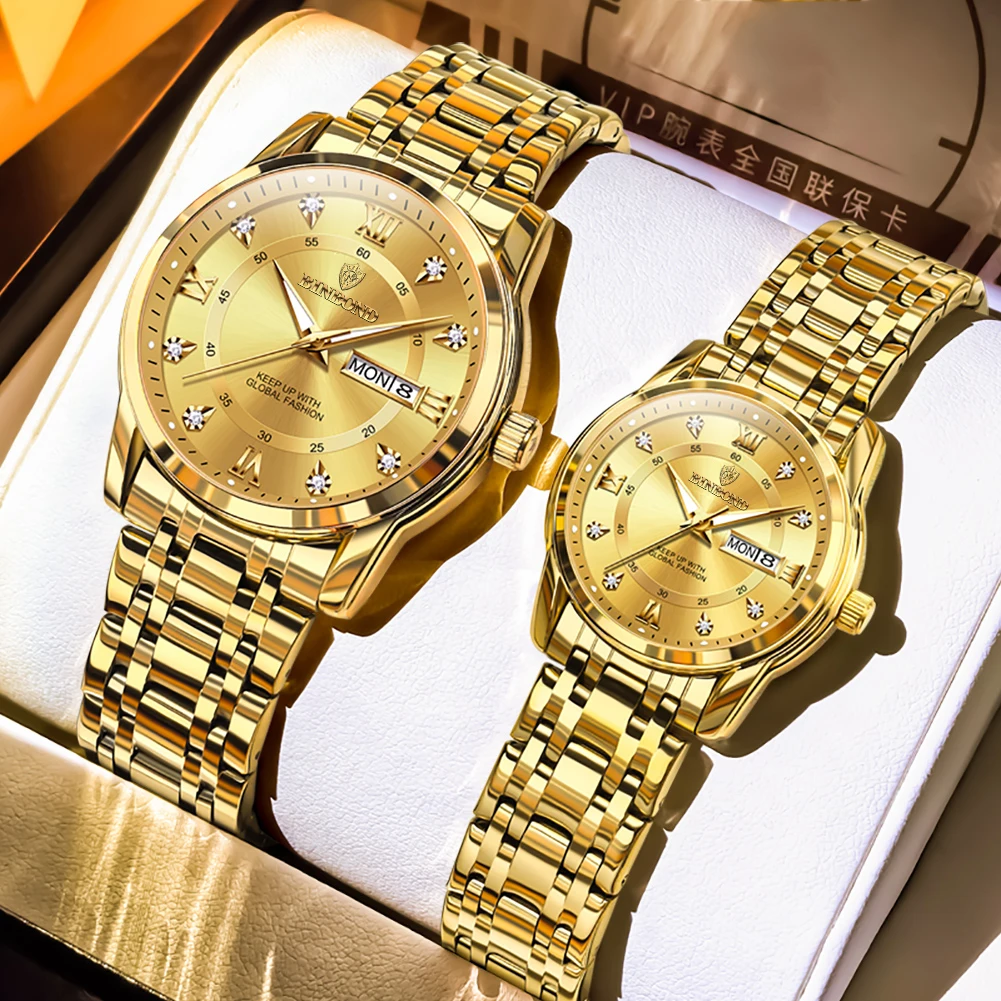 BINBOND 커플 시계 연인을위한 럭셔리 골드 패션 오리지널 쿼츠 시계 로마 더블 스케일 방수 빛나는 날짜 주 Relo