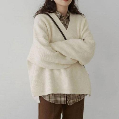 여성 니트 스웨터 브이넥 루즈 캐주얼 두꺼운 기본 셔츠 가을 겨울 한국 스타일 부드러운 레트로 스타일 긴팔 탑