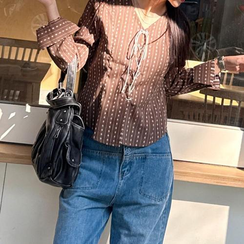 [옷자락]여성 아이렛 레이스업 리본 보헤미안 꽃무늬 블라우스