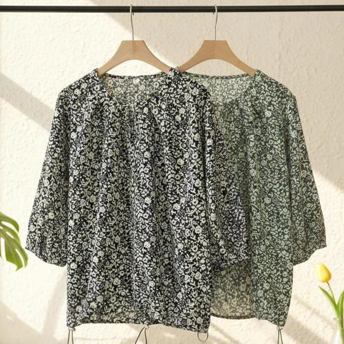 [신상오픈런]여성 꽃무늬 배색 라운드 반팔 블라우스 휴양지 스타일
