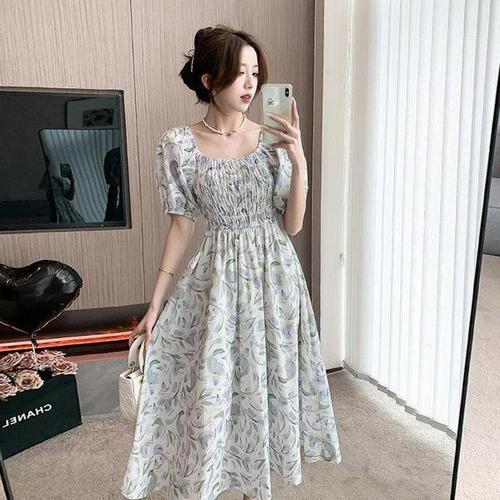 [다잇템]여성 스퀘어넥 꽃패턴 롱 후레아 반소매 원피스