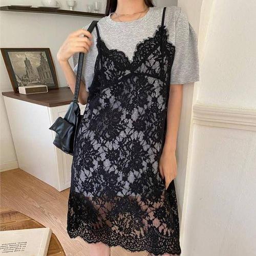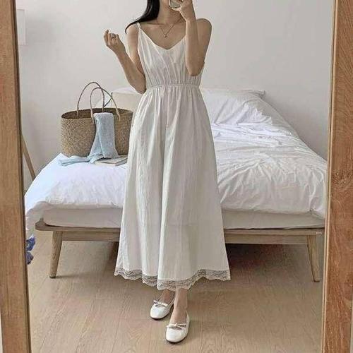 TKX 1+1 여성 여름 홈웨어 캐주얼 라운지웨어 롱 끈나시 원피스 여자 귀여운 레이스 장식 민소매 드레스 K78
