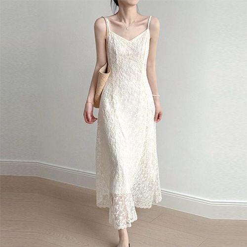 여성 레이스 원피스 캐주얼 봄 여름 하이웨이스트 A라인 원피스 슬림핏 기질 바캉스룩 끈나시 원피스 ZZL