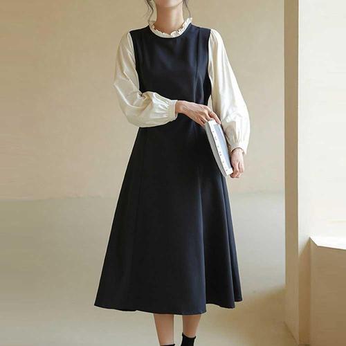 [오너클랜]인기상품 여성 레이스 넥 허리 매듭끈 원피스 소매배색 하객룩 [WFC9F4E_260404]