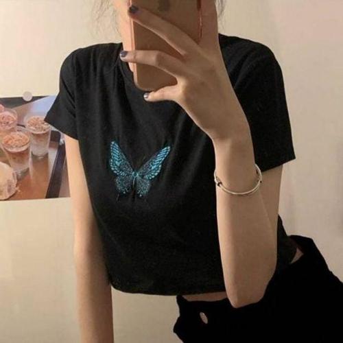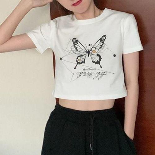 [에이치플러스몰]여름 인기 여성 나비 슬림핏 감성 라운드넥 크롭 반팔