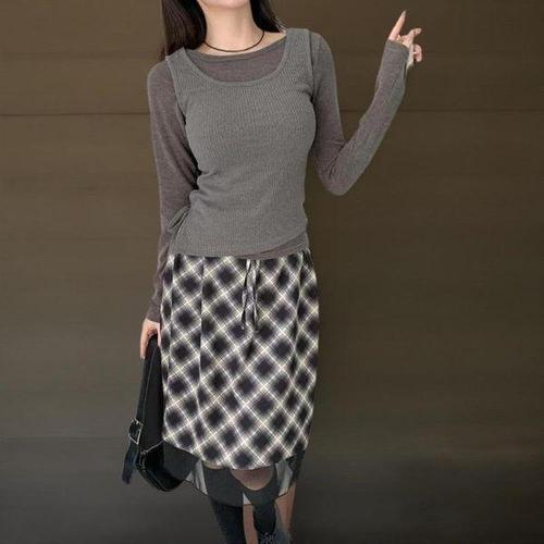 라티움 HC34 신축성좋은 콩단추 티 체크민소매 원피스 셋트 T2533 se08