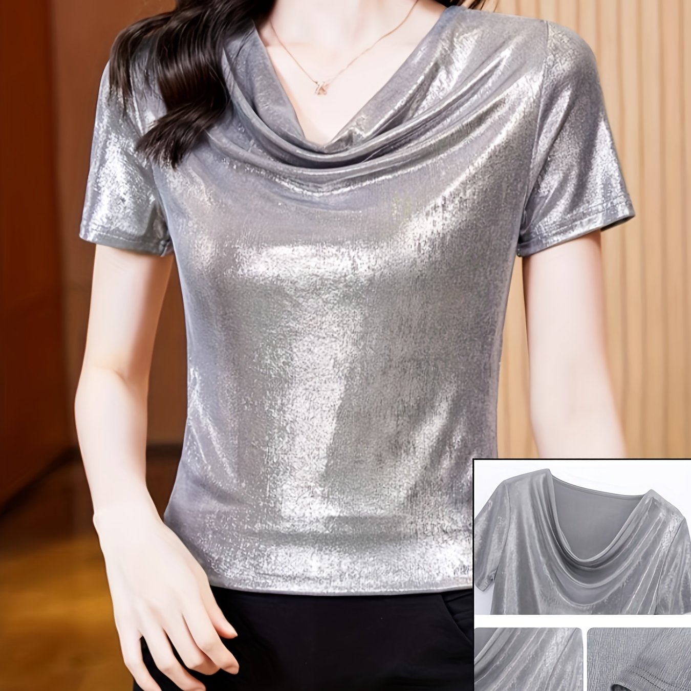 TEMU ZH41055 여성용 슬림핏 광택 베이스 레이어 고급스러운 느낌의 보트넥 반팔 티셔츠